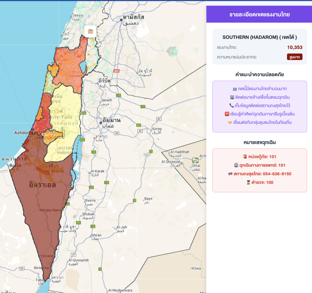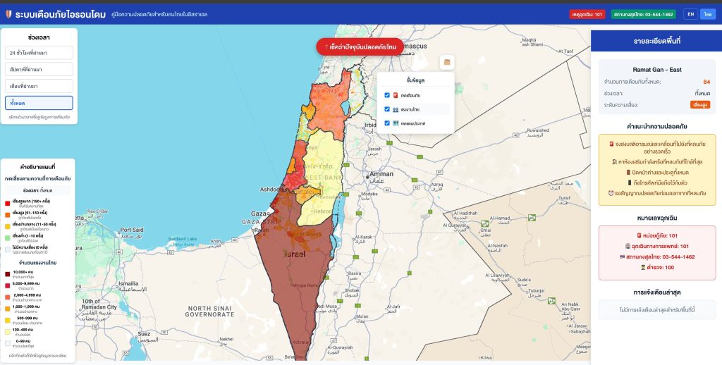 อยากไรก็ตามผมได้ทดลองจัดทำเว็บไซต์ที่ใช้แจ้งเตือนการโจมตีทางอากาศและบริเวณที่คนไทยอยู่จากข้อมูล 2 ส่วนทั้งจาก Red Alert และจากทางกรมแรงงานเองได้มาเป็นเว็บไซต์ด้านล่างนี้ และพบว่าเราสามารถใช้ระบบแบบนี้ในการติดตามและประเมินความปลอดภัยของแรงงานไทยในอิสราเอลเบื้องต้นได้ ผ่านการนำเอาข้อมูลที่อยู่ปัจจุบันและความถี่การแจ้งเตือนมาวิเคราะห์เข้าด้วยกัน