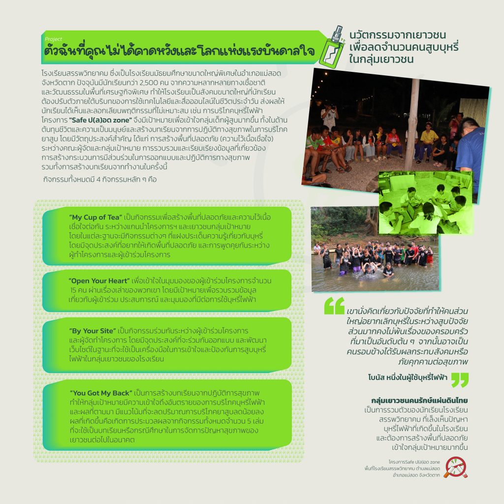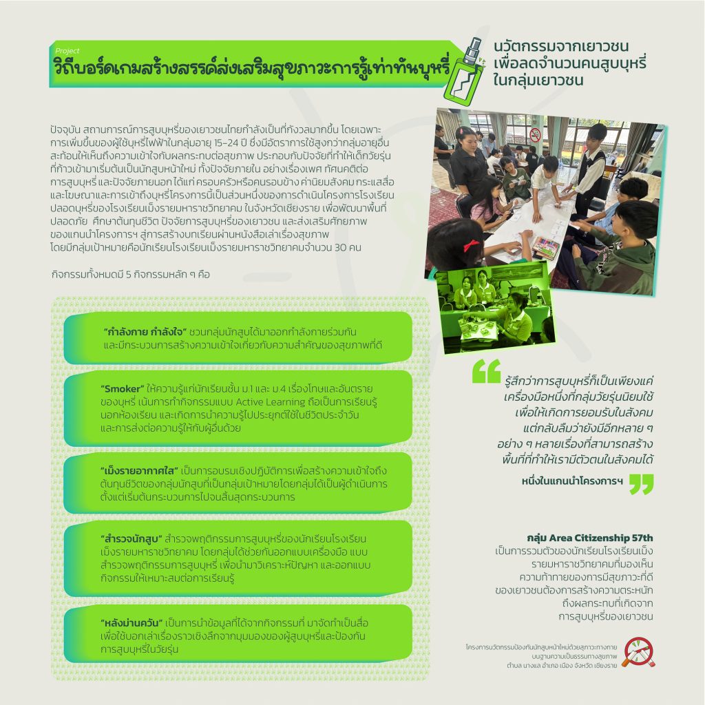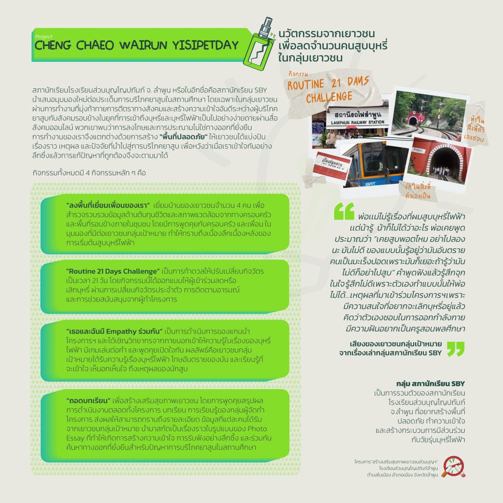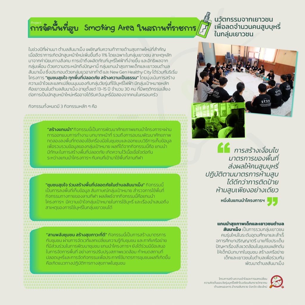 มูลนิธิโกมลคีมทอง สาขาภาคเหนือต้องการจัดงานอีเวนท์และนิทัศรรการเพื่อนำเสนอนวัตกรรมของเยาวชนที่เข้าร่วมโครงการ โดยจัดขึ้นวันที่ 29 พฤศจิกายน ถึงวันที่ 1 ธันวาคม 2564 ซึ่งนวัตกรรมที่เยาวชนในโครงการได้สร้างขึ้นจะสามารถแบ่งออกเป็น 2 เรื่องหลักๆ คือวิธีการลดหรือเลิกบุหรี่ไฟฟ้าและการลดอุบัติเหตุ โดยทางมูลนิธิต้องการให้คนในเชียงใหม่และนักท่องเทียวบางส่วนได้เห็นแนวคิดของเยาวชน