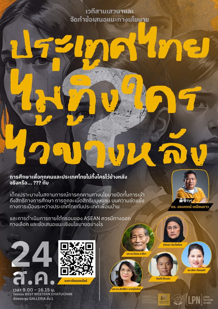 มูลนิธิเครือข่ายส่งเสริมคุณภาพชีวิตแรงงาน เป็นองค์กรพัฒนาเอกชนที่ทำงานเพื่อสาธารณประโยชน์ด้านเด็กและแรงงานที่มุ่งมั่นส่งเสริมคุณภาพชีวิต คุ้มครองสิทธิความเสมอภาค การพึ่งตนเอง และสรรค์สร้างการอยู่ร่วมกันในสังคมอย่างสันติ ร่วมกับองค์กรภาคี สถาบันเอเชียศึกษา จุฬาลงกรณ์มหาวิทยาลัย เครือข่ายเยาวชนอาเซียน และศูนย์แบ่งต่อ มูลนิธิกระจกเงา จะจัดเวทีสานเสวนา และจัดทำข้อเสนอแนะทางนโยบายหัวข้อ การศึกษาเพื่อทุกคน และประเทศไทยไม่ทิ้งใครไว้ข้างหลัง จริงหรือ…??? กับเด็กเปราะบางในสถานการณ์การคุกคามทางนโยบายปิดกั้นการเข้าถึงสิทธิทางการศึกษา การถูกละเมิดสิทธิมนุษยชนบนความขัดแย้งทางการเมืองระหว่างประเทศไทยกับประเทศเพื่อนบ้านและการดำเนินการภายใต้กรอบของ ASEAN ควรมีทางออก ทางเลือกและข้อเสนอแนะเชิงนโยบายอย่างไร ในวันอาทิตย์ที่ 24 สิงหาคม 2568 เวลา 9.00 – 16.15 น. ณ ห้องประชุม GALLERIA ชั้น 1 โรงแรม Best Western Chatuchak เขตจตุจักร กรุงเทพมหานคร